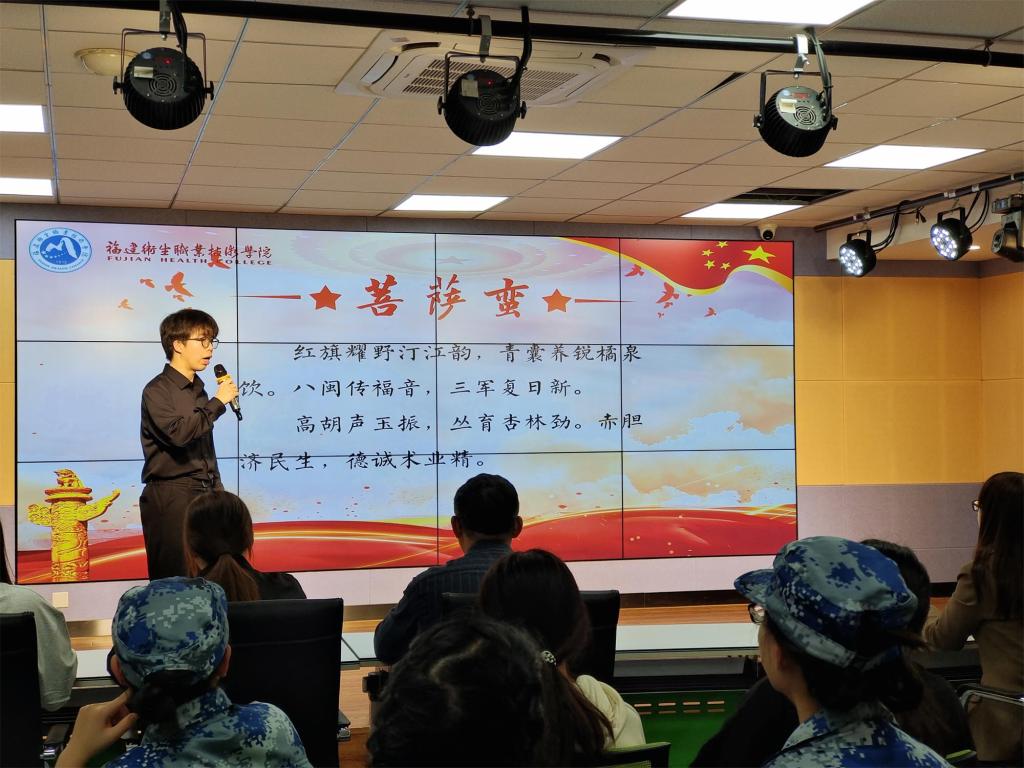 “紅旗耀野汀江韻,青囊養(yǎng)銳橘泉飲。八閩傳福音,三軍復(fù)日新。高胡聲玉振,叢育杏林勁。赤膽濟(jì)民生,德誠術(shù)業(yè)精?!眮碜蚤}南地區(qū)的學(xué)子用富有壓韻與節(jié)奏之美的閩南話聲情并茂地朗誦原創(chuàng)詩《菩薩蠻》,該詩敘述了“紅色華佗”傅連暲等閩西革命子弟兵的英雄事跡,講述了福音醫(yī)院從閩西遷往江西成立中央紅軍醫(yī)院的崢嶸故事。冒著槍林彈雨救治傷員,醫(yī)治窮苦百姓,這種無畏生死、救死扶傷的精神使同學(xué)們無不動(dòng)容,不僅展示了對(duì)紅醫(yī)前輩的敬仰,更表達(dá)了傳承紅醫(yī)精神、在醫(yī)學(xué)探索中砥礪前行的決心。