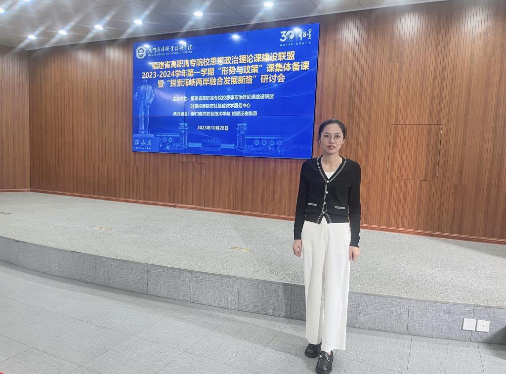 2023年10月27日-29日,馬克思主義學(xué)院青年教師張茵珠赴廈門參加2023-2024學(xué)年第一學(xué)期“形勢與政策”課集體備課暨“探索海峽兩岸融合發(fā)展新路”學(xué)術(shù)研討會。本次會議由全國高校思政課“手拉手”集體備課中心(福建師范大學(xué))、福建省高職高專院校思想政治理論課建設(shè)聯(lián)盟和中共中央宣傳部時(shí)事報(bào)告雜志社福建教學(xué)服務(wù)中心主辦,由廈門海洋職業(yè)技術(shù)學(xué)院和超星泛雅集團(tuán)承辦。全省30多所高職高專院校近百名專家、學(xué)者、思政課教師齊聚一堂。
