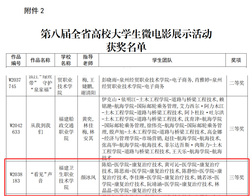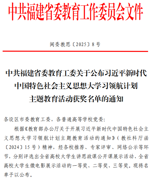 日前,由中共福建省委教育工作委員會(huì)主辦的習(xí)近平新時(shí)代中國特色社會(huì)主義思想大學(xué)習(xí)領(lǐng)航計(jì)劃系列主題活動(dòng)獲獎(jiǎng)名單揭曉,我校學(xué)生陳焰、黃可沁、陳思雨、陳靜怡、李佳琳、姚若冰、阮靖涵、林晶晶的微電影作品《“看見”聲音》獲得第八屆全省高校大學(xué)生微電影展示活動(dòng)三等獎(jiǎng),指導(dǎo)老師為顏冰鳳。