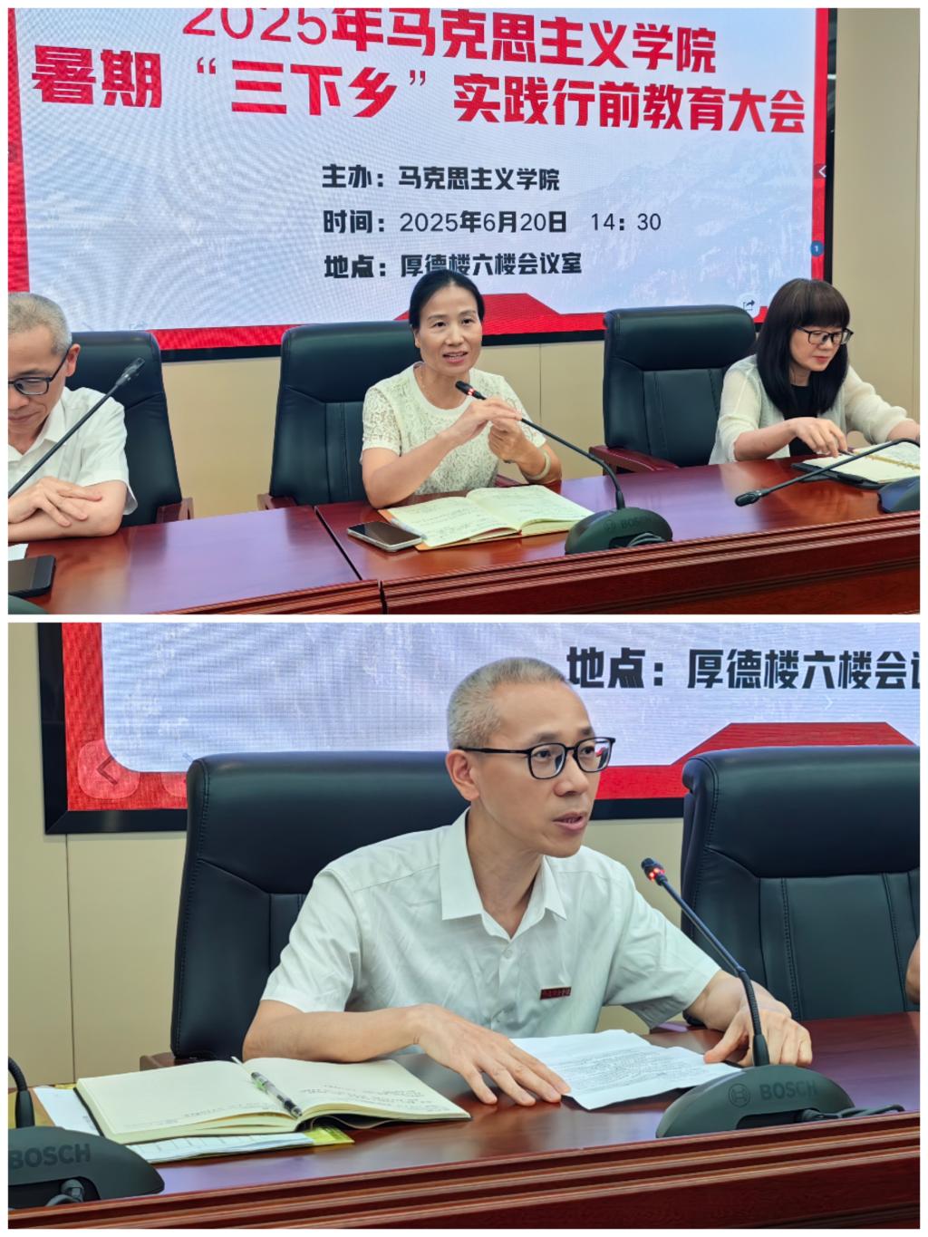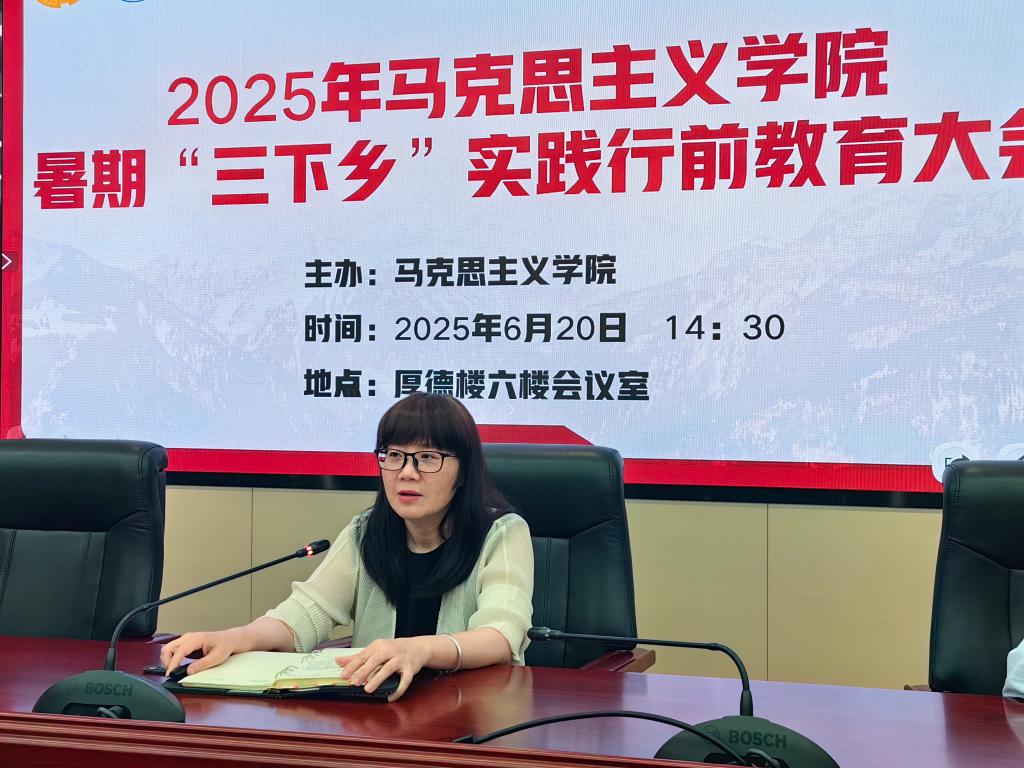 為深入學(xué)習(xí)貫徹習(xí)近平新時(shí)代中國(guó)特色社會(huì)主義思想,全面落實(shí)黨的二十大關(guān)于青年工作的重要部署,6月20日,馬克思主義學(xué)院在厚德樓六樓會(huì)議室舉行2025年暑期“三下鄉(xiāng)”社會(huì)實(shí)踐行前安全教育培訓(xùn)會(huì)。馬克思主義學(xué)院黨總支書(shū)記、院長(zhǎng)熊美蘭,副院長(zhǎng)來(lái)朋珍,第二黨支部書(shū)記胡濟(jì)林以及“馬上逐夢(mèng)隊(duì)”和“星火傳薪實(shí)踐隊(duì)”的指導(dǎo)老師和學(xué)生參加。會(huì)議由馬克思主義學(xué)院黨總支副書(shū)記賴文金主持。