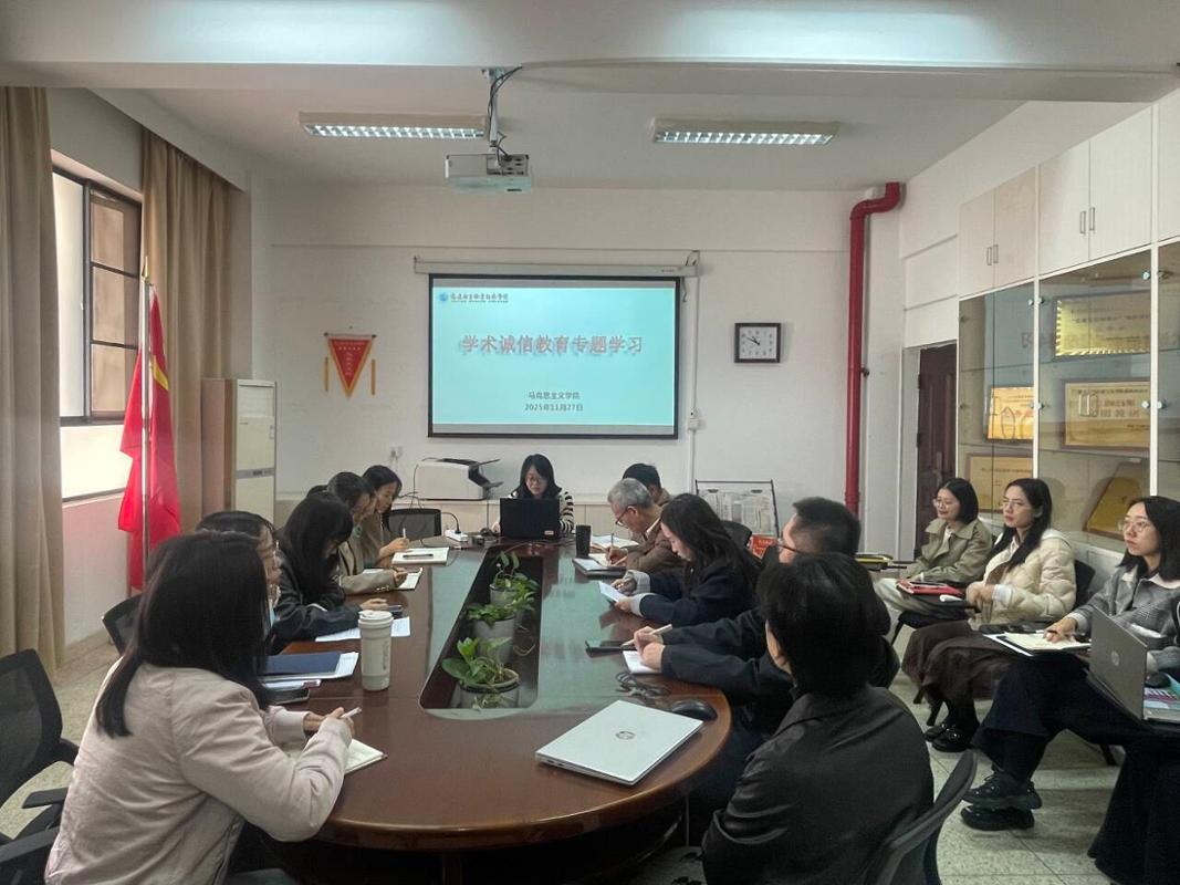 為深入貫徹落實立德樹人根本任務(wù),弘揚求真務(wù)實的學術(shù)精神,營造風清氣正的學術(shù)環(huán)境,2025年11月27日,馬克思主義學院在厚德樓106會議室開展學術(shù)誠信教育專題學習活動?;顒佑神R克思主義學院院長熊美蘭主持,馬克思主義學院全體教師出席本次活動。