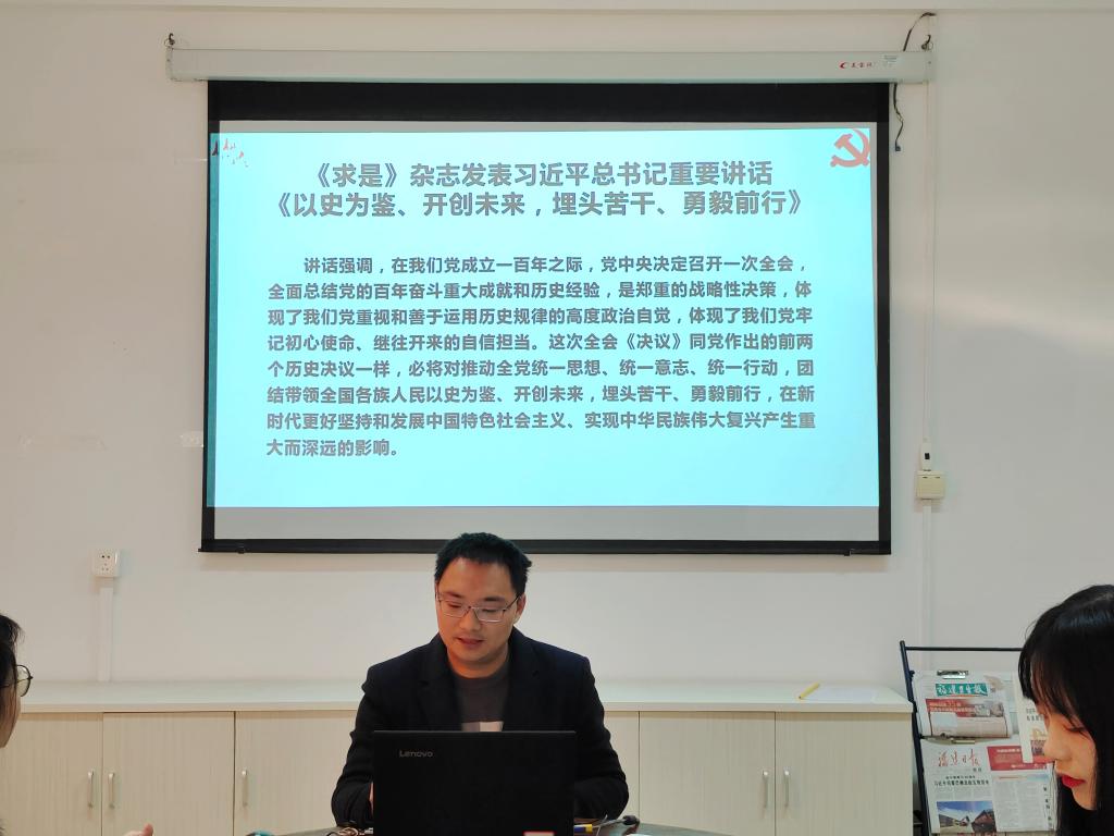 張崇飛同志分享了學習《求是》雜志發(fā)表習近平總書記《以史為鑒、開創(chuàng)未來,埋頭苦干、勇毅前行》(在黨的十九屆六中全會第二次全體會議上的重要講話)的心得體會。他強調(diào),全體黨員教師應當堅定歷史自信,堅持自我革命,發(fā)揚斗爭精神,爭做四有好老師。
