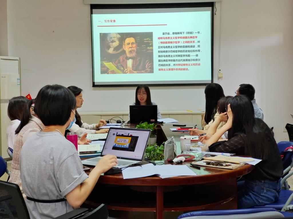 2022年4月14日下午,直屬馬克思主義學(xué)院黨支部第一黨小組在會(huì)議室107開展經(jīng)典研學(xué)分享活動(dòng)。此次活動(dòng)由黨支部委員羅蕓主持,顏冰鳳同志主講,研學(xué)內(nèi)容為恩格斯的《路德維?!べM(fèi)爾巴哈和德國古典哲學(xué)的終結(jié)》。