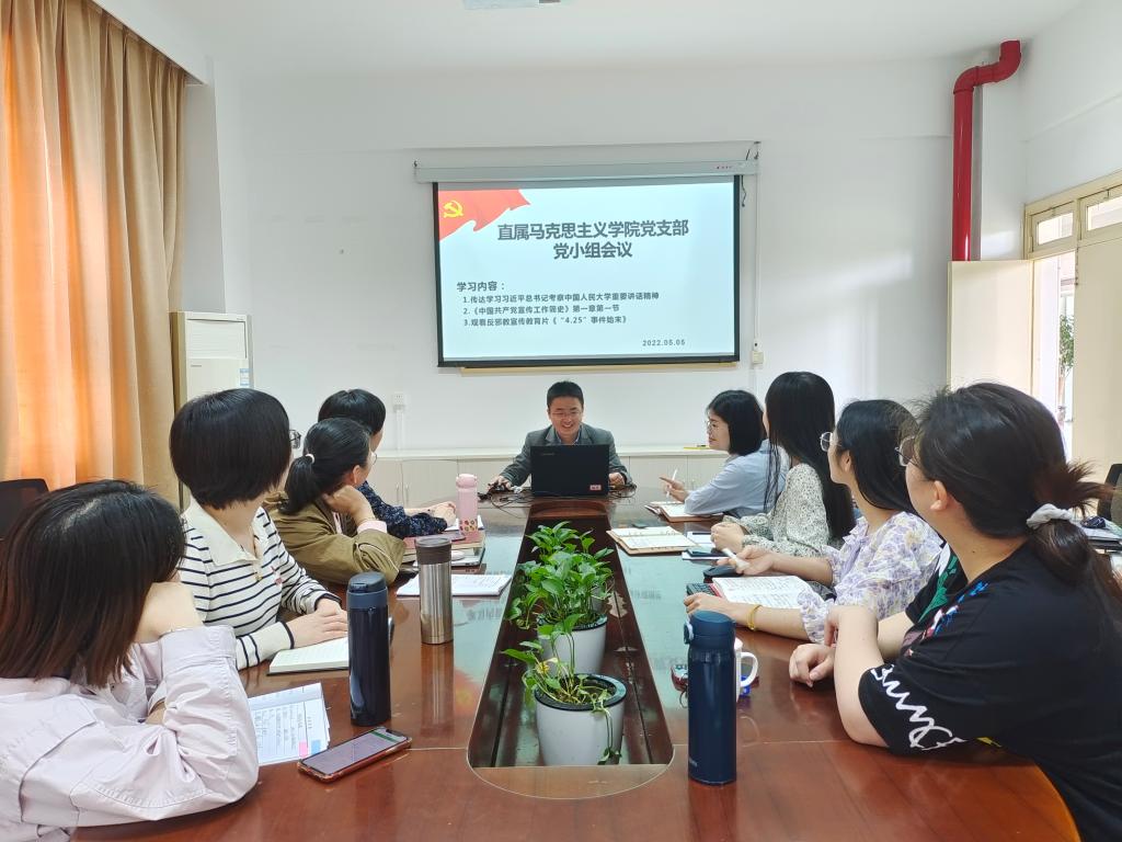 2022年5月5日,直屬馬克思主義學院黨支部第一黨小組在會議室107開展理論學習活動,本次理論學習的主要內(nèi)容有:傳達學習習近平總書記考察中國人民大學重要講話精神、《中國共產(chǎn)黨宣傳工作簡史》,觀看反邪教宣傳教育片《“4.25”事件始末》?;顒佑牲h支部副書記來朋珍同志主持。