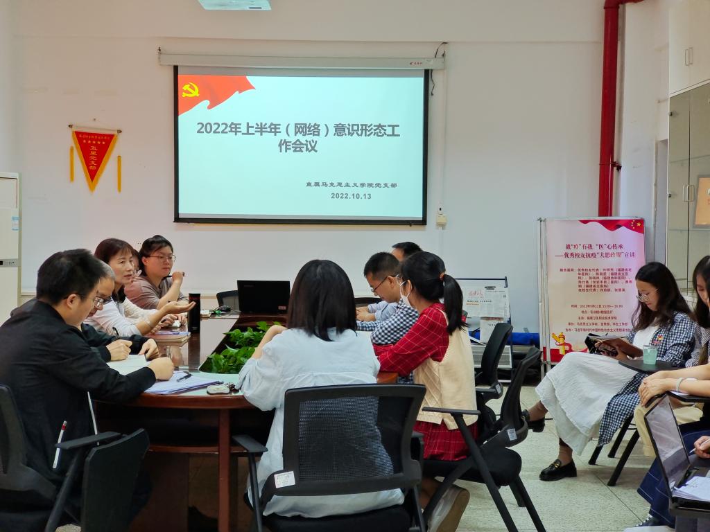10月13日上午,直屬馬克思主義學院黨支部2022年上半年(網(wǎng)絡)意識形態(tài)工作會議在行政樓107會議室召開。支部全體黨員參加了會議,會議由黨支部副書記來朋珍主持。