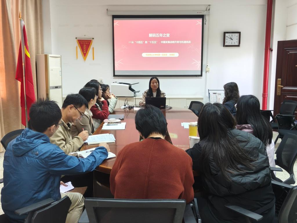 為深入學(xué)習(xí)宣傳貫徹黨的二十屆四中全會(huì)精神,落實(shí)立德樹(shù)人根本任務(wù),2025年12月4日,馬克思主義學(xué)院第一黨支部書(shū)記來(lái)朋珍在厚德樓107會(huì)議室開(kāi)展《解碼五年之變:從“十四五”到“十五五”,中國(guó)發(fā)展的戰(zhàn)略升維與機(jī)遇挑戰(zhàn)》專題黨課。