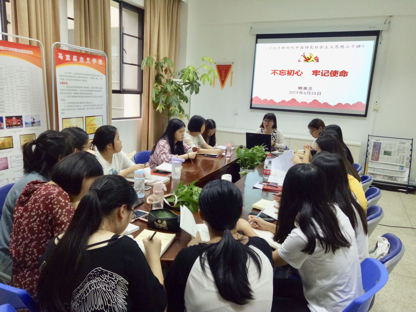 為學(xué)習(xí)貫徹《習(xí)近平新時代中國特色社會主義思想三十講》精神,習(xí)近平新時代中國特色社會主義思想讀書社原夢隊全體同學(xué)于2019年6月25日晚上,在馬院研討室上了本學(xué)期最后一次課,聽取熊美蘭老師作題為“不忘初心、牢記使命”專題報告,并結(jié)合同學(xué)的新思想學(xué)習(xí)和學(xué)業(yè)攻讀進行了討論。
