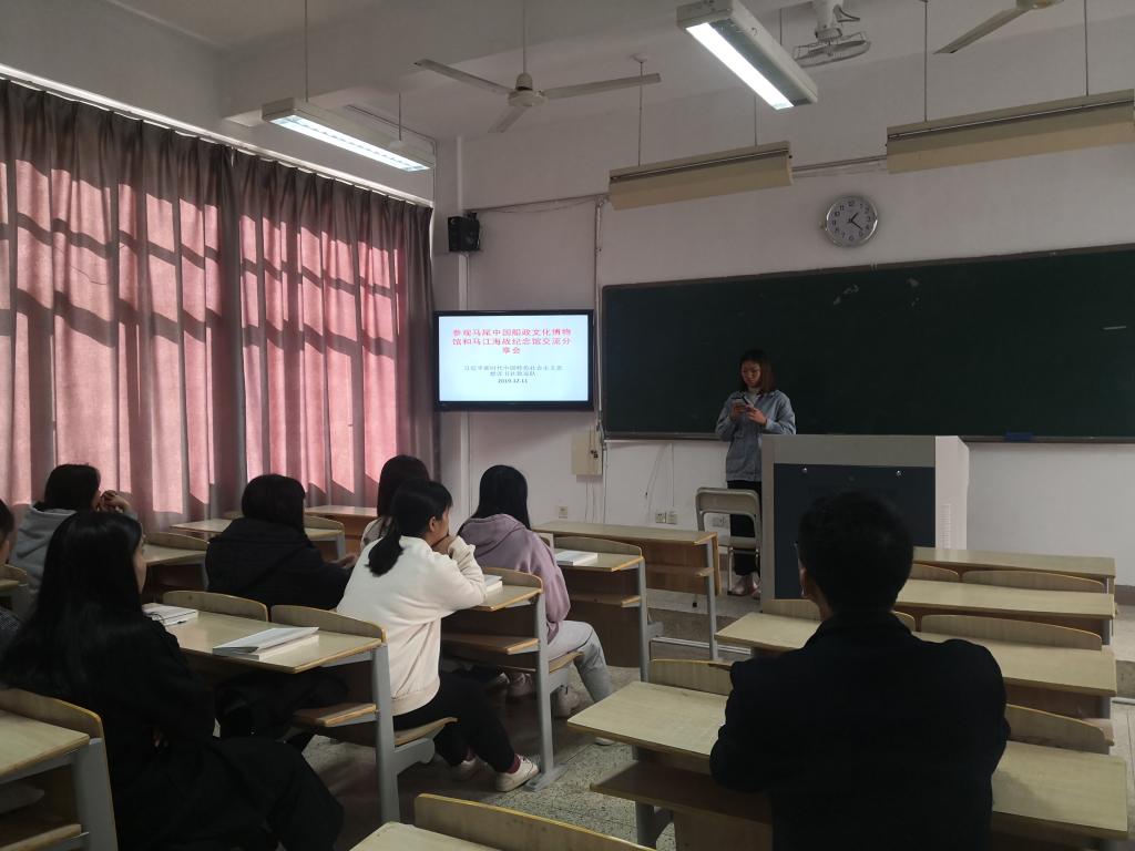 2019年12月11日下午,習(xí)近平新時(shí)代中國(guó)特色社會(huì)主義思想讀書(shū)社致遠(yuǎn)隊(duì)在教學(xué)樓101開(kāi)展參觀馬江海戰(zhàn)紀(jì)念館和中國(guó)船政文化博物館交流分享會(huì)。會(huì)議由指導(dǎo)老師江洪老師主持,致遠(yuǎn)隊(duì)全體成員參加了會(huì)議。