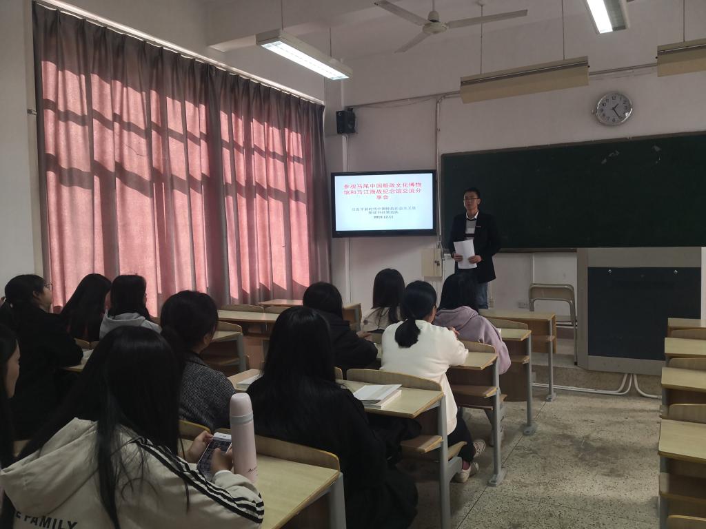 首先江洪老師根據(jù)參觀內(nèi)容,結(jié)合歷史,系統(tǒng)地梳理了馬江海戰(zhàn)和中國(guó)船政文化相關(guān)內(nèi)容,并對(duì)一些具體內(nèi)容進(jìn)行了深入講解。緊接著致遠(yuǎn)隊(duì)成員劉婧和林詩(shī)怡先后上臺(tái)分享了自己參觀馬江海戰(zhàn)紀(jì)念館和中國(guó)船政文化博物館的心得體會(huì)。劉婧同學(xué)分享了中坡炮臺(tái)和中法馬江海戰(zhàn)遺址等大量的圖片及介紹,她從中深切體會(huì)到官兵們不屈抗?fàn)幍挠職?。林?shī)怡同學(xué)分享了洋務(wù)運(yùn)動(dòng)興起的背景,以及著名歷史人物左宗棠和沈葆楨創(chuàng)立船政的事跡,展示了中國(guó)近代船政的發(fā)展過(guò)程。臺(tái)下聽(tīng)講的同學(xué)聚精會(huì)神,時(shí)不時(shí)發(fā)表自己的想法。