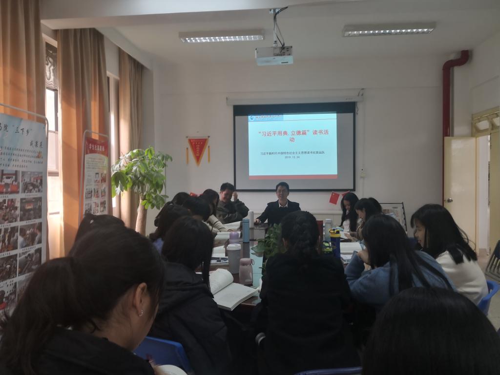 為深入學習宣傳貫徹習近平新時代中國特色社會主義思想,2019年12月24日下午,習近平新時代中國特色社會主義思想讀書社致遠隊在行政樓107學習交流《習近平用典》立德篇?;顒佑芍笇?dǎo)老師江洪老師主持,致遠隊全體成員參加了活動。