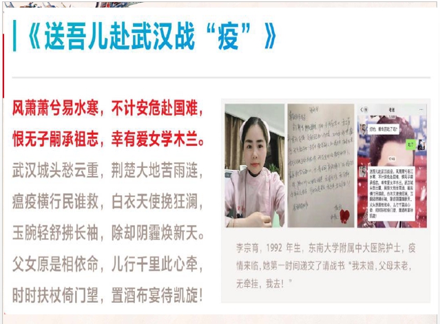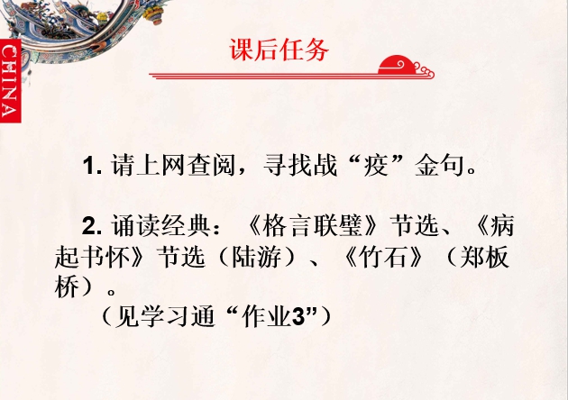 在課程的最后,老師問到什么是戰(zhàn)“疫”精神?有人說是國家,有人說是團結,有人說是舍小家為大家,但歸根結底是“中國精神”!鐘南山院士說過:“武漢,本身就是一座很英雄的城市?!倍袊?,本身就是一個很英雄的國家,處處體現中國精神。今天的中國,舉國堅定信心、同舟共濟、科學防治、精準施策,打贏新冠肺炎疫情阻擊戰(zhàn)勝利在望!熊美蘭老師給我們布置了作業(yè),誦讀本次課程中的經典詩句以及在網上查閱戰(zhàn)“疫”金句,同時讓我們深深思考其中的典故。