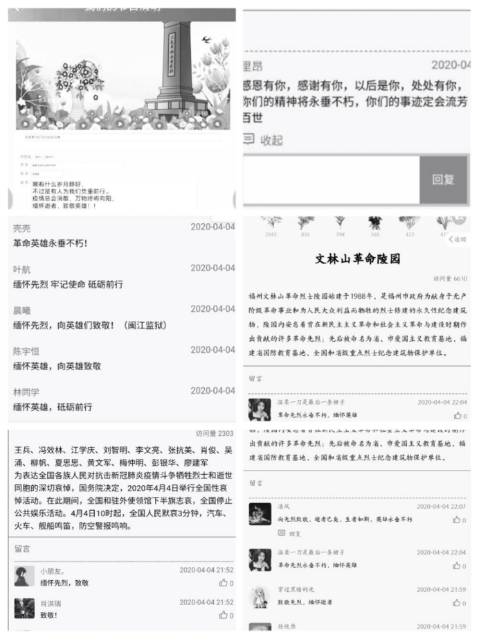 本次活動(dòng)主要包括兩個(gè)部分:討論追憶先烈、進(jìn)行網(wǎng)上祭奠英烈留言。活動(dòng)開展過程由負(fù)責(zé)人組織本社團(tuán)成員們討論追憶先烈的過程中去感受中英雄事跡,微信公眾號(hào)搜索清明紀(jì)念或中國(guó)英烈網(wǎng)祭奠平臺(tái)發(fā)表祭奠感言,表達(dá)對(duì)英烈的感恩和敬仰。此次活動(dòng)的舉辦引得學(xué)生熱烈反響,有助于同學(xué)們學(xué)習(xí)和弘揚(yáng)中華民族傳統(tǒng),讓同學(xué)們了解清明節(jié)的歷史由來和傳統(tǒng)習(xí)俗。
