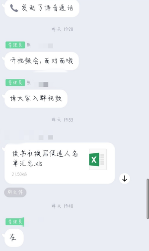 在13位同學(xué)的演講結(jié)束后,會議進(jìn)入第二個議程,新干事退出群聊,由指導(dǎo)老師和18級正副社長進(jìn)行討論確定每個崗位最合適的人選,并由雷榕芳社長在新思想讀書社工作群中公示名單。