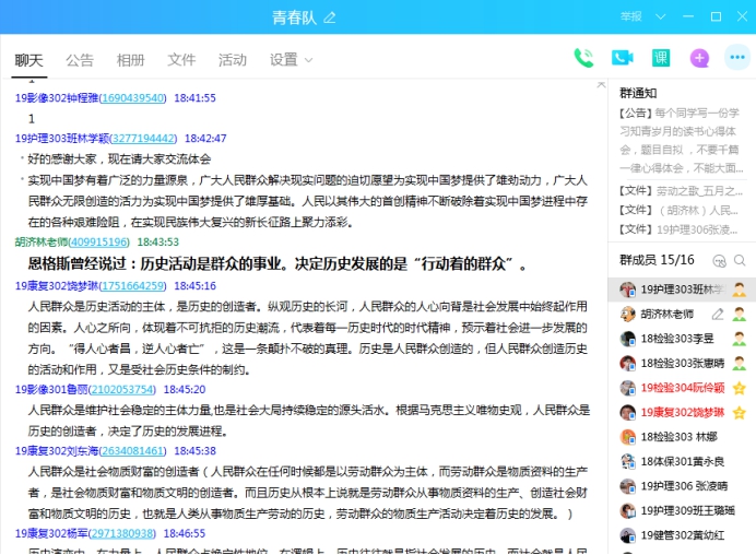 恩格斯曾經(jīng)說(shuō)過(guò),歷史活動(dòng)是群眾的事業(yè),決定歷史發(fā)展的是“行動(dòng)著的群眾”。為了更好地學(xué)習(xí)和認(rèn)知人民群眾在歷史中的地位和作用,2020年4月29日,習(xí)近平新時(shí)代中國(guó)特色社會(huì)主義思想讀書(shū)社青春隊(duì)的同學(xué)們?cè)诤鷿?jì)林老師的指導(dǎo)下開(kāi)展了第三次抗擊疫情的線上交流學(xué)習(xí)。