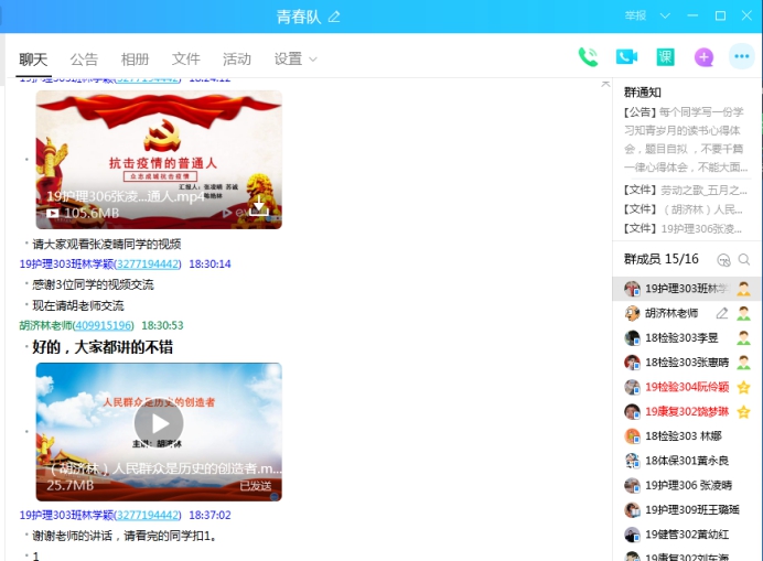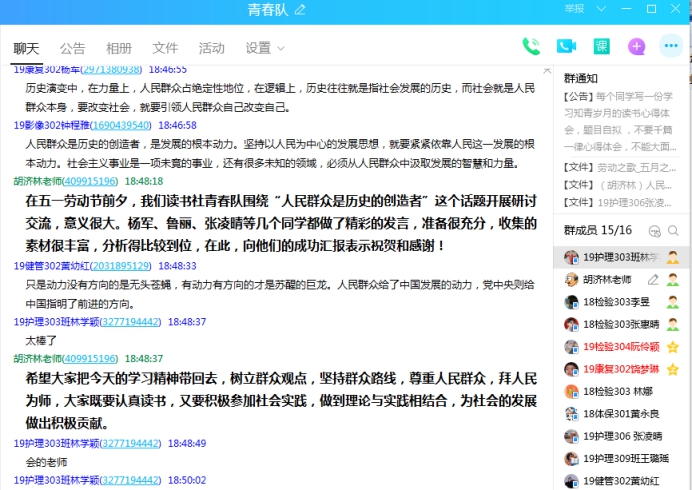 同學(xué)們?cè)赒Q進(jìn)行簽到后,首先楊軍、魯麗、張凌晴3位同學(xué)分別向同學(xué)們進(jìn)行了《為了人民謀發(fā)展的人大代表——季炳云》、《革命戰(zhàn)爭(zhēng)年代以及社會(huì)主義建設(shè)時(shí)期的人民觀》以及《抗擊疫情的普通人》的分享和交流,她們的分享讓我們明白了人民群眾是維護(hù)社會(huì)穩(wěn)定的主體力量,也是社會(huì)大局持續(xù)穩(wěn)定的源頭活水。