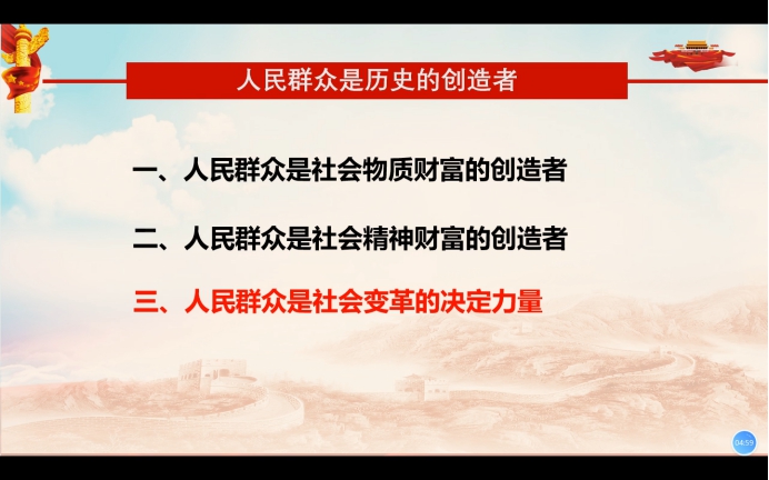 同學(xué)們進(jìn)行視頻交流后,胡濟(jì)林老師進(jìn)行了《人民群眾是歷史的創(chuàng)造者》的專題報(bào)告。胡濟(jì)林老師從“人民群眾是社會(huì)物質(zhì)財(cái)富的創(chuàng)造者”、“人民群眾是社會(huì)精神財(cái)富的創(chuàng)造者”、“人民群眾是社會(huì)變革的決定力量”三個(gè)方面向我們講述了為什么人民群眾是歷史的創(chuàng)造者。通過(guò)學(xué)習(xí),我們認(rèn)識(shí)到人民群眾是一個(gè)歷史范疇,是指一切對(duì)社會(huì)歷史起著推動(dòng)作用的人們。人民群眾是中國(guó)共產(chǎn)黨的執(zhí)政之基、力量之源。