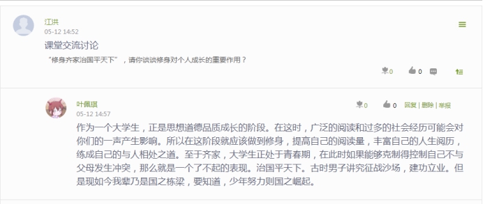 《修身篇》是《習(xí)近平用典》的第四篇,在這篇中,習(xí)近平總書記引用名言典故,強(qiáng)調(diào)了領(lǐng)導(dǎo)干部“修身”的重要性,深刻闡述了修身立德的方法。指導(dǎo)老師江洪老師通過(guò)線上觀看視頻、在線討論、提問(wèn)、觀看PPT等形式開展這次課的學(xué)習(xí),使同學(xué)們對(duì)“修身自律”有了更深的理解,教導(dǎo)同學(xué)們要“吾日三省吾身”,做到自重、自省、自警、自勵(lì),實(shí)現(xiàn)慎獨(dú)、慎微、慎初、慎友。