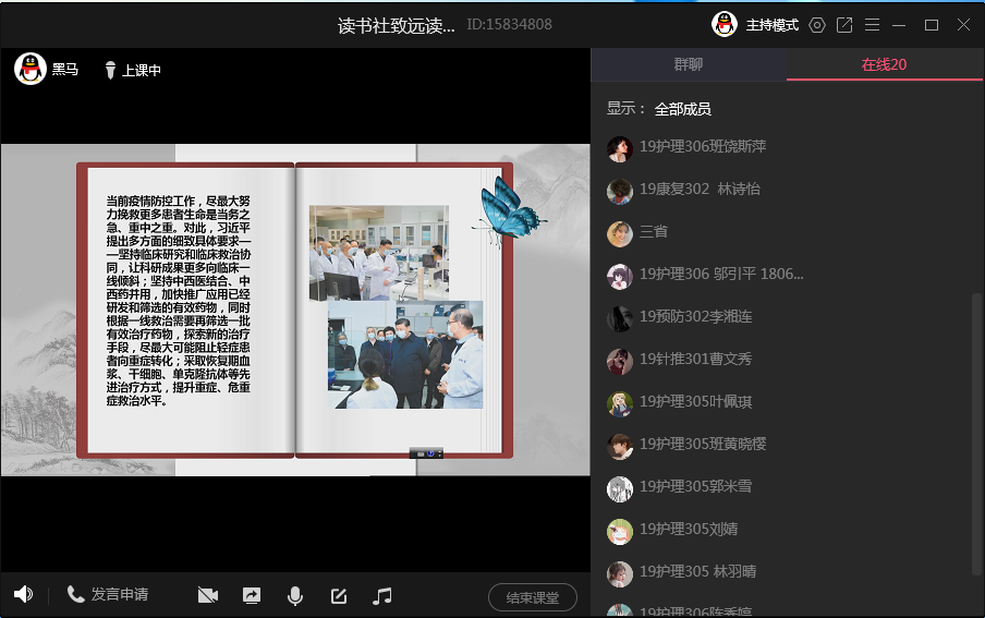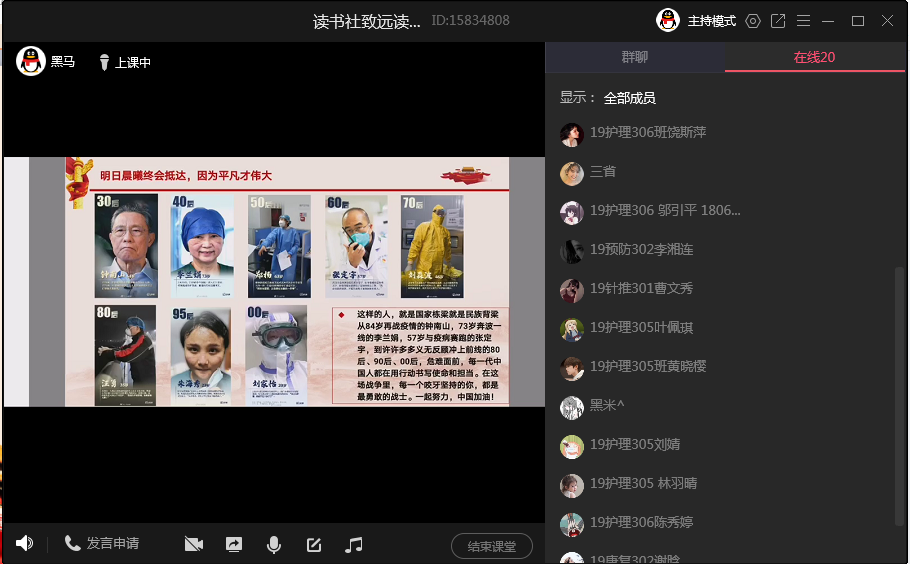 前期,同學(xué)們分成幾組,圍繞中國防控疫情的重大事件,各自制作了微視頻。在本次交流展示活動(dòng)中,第一組的同學(xué)談了他們對這次疫情的認(rèn)識(shí),以及如何做好防護(hù)措施等內(nèi)容;第二組的微視頻介紹了鐘南山院士和“95后”護(hù)士抗擊疫情的感人故事;第三組的微視頻講述了李蘭娟、張定宇、朱海秀等醫(yī)護(hù)工作人員與新冠病毒斗爭的先進(jìn)事跡;第四組的微視頻深刻闡述了習(xí)近平新時(shí)代中國特色社會(huì)主義思想的重要作用;第五組同學(xué)從武漢封城、火神山和雷神山方艙醫(yī)院的建立、中國特色社會(huì)主義制度的優(yōu)越性和先進(jìn)性以及世界衛(wèi)生組織對中國抗疫的評(píng)價(jià)等角度制作了視頻;第六組同學(xué)在視頻中為我們講述了“最美面罩姐姐”、“‘鐵娘子’落淚”等感人故事。