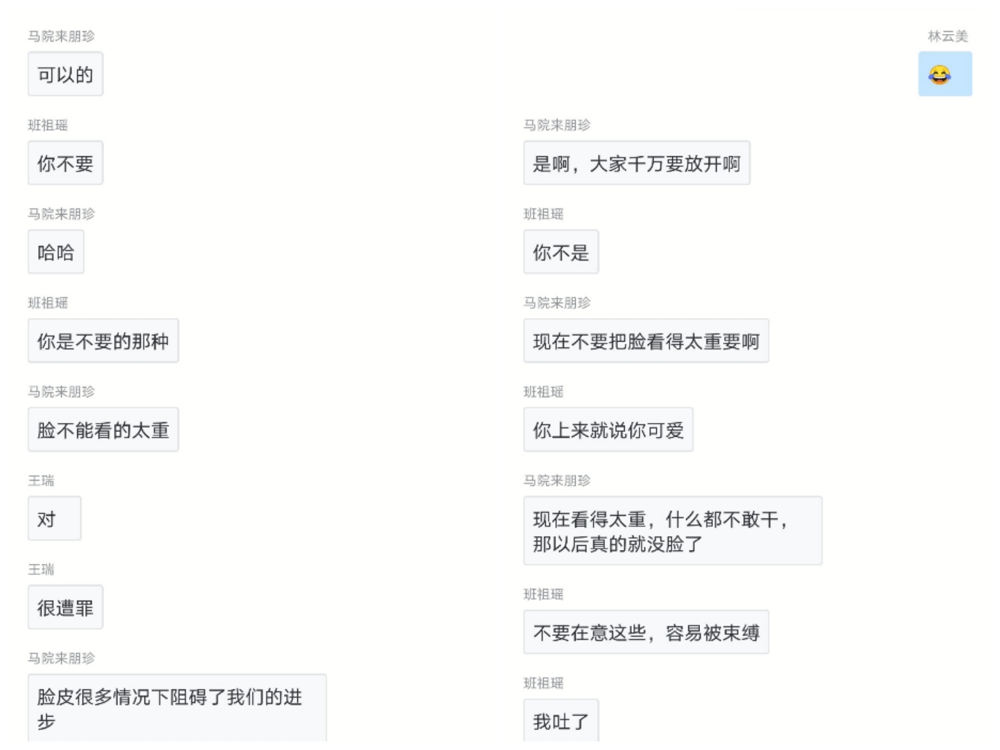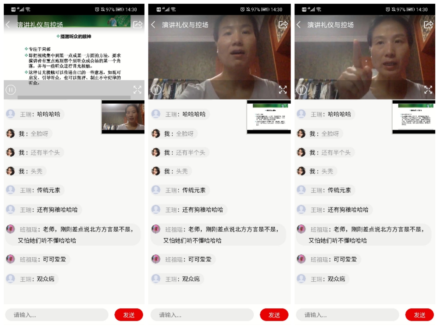 其中,作為班長的王旭熙同學以其主題為“不要臉”的脫口秀使人印象深刻,深入人心,還有鄭盈盈同學講述的“健忘”故事,引起了大家的強烈共鳴。同時,來朋珍老師及演講班的同學在其聊天框里“實時熱聊”,對同學們的表現(xiàn)進行了“一對一”的點評。