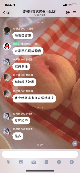 2020年6月9日下午,習近平新時代中國特色社會主義思想讀書社致遠隊在QQ群開展學習《習近平用典》心得體會分享交流活動,這也是習近平新時代中國特色社會主義思想讀書社社團選修課《習近平用典》的最后一課。讀書社致遠隊成員全員準時到課參加學習,活動由指導(dǎo)老師江洪老師主持。