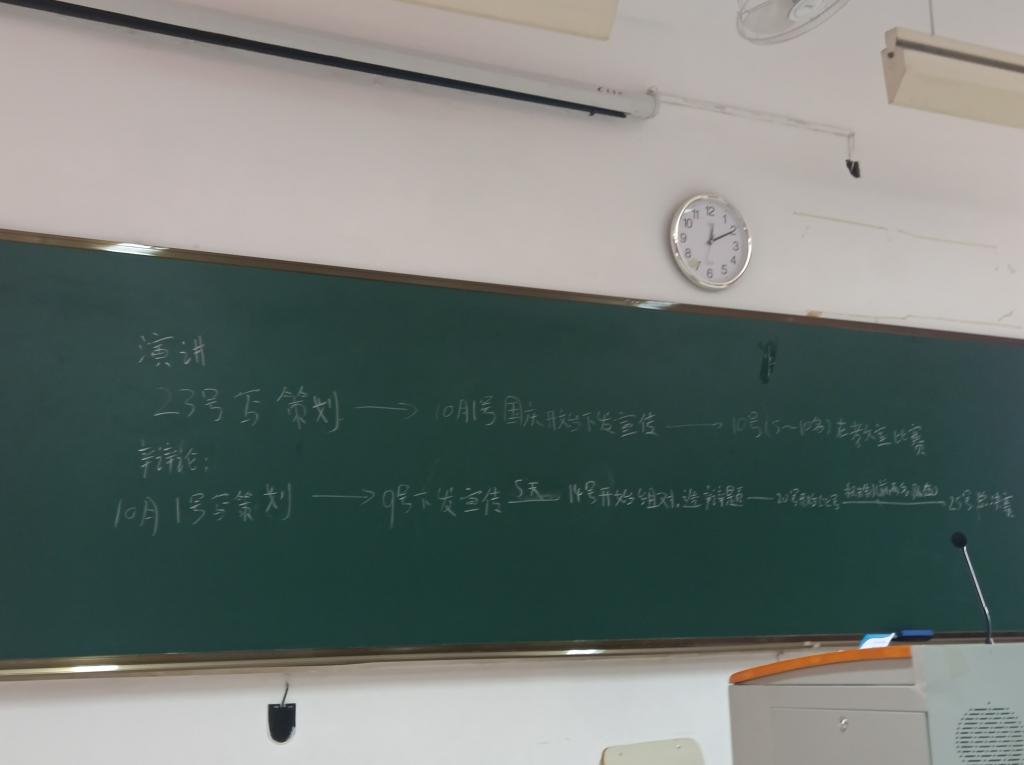 本次活動(dòng)的主題是“新學(xué)期,新氣象”,這次活動(dòng),我們對(duì)于10月份即將舉辦的演講與辯論賽進(jìn)行了細(xì)致的安排工作,對(duì)于活動(dòng)的策劃時(shí)間,宣發(fā)工作,辯題選擇時(shí)間,以及比賽的賽制進(jìn)行了具體的安排與說(shuō)明。