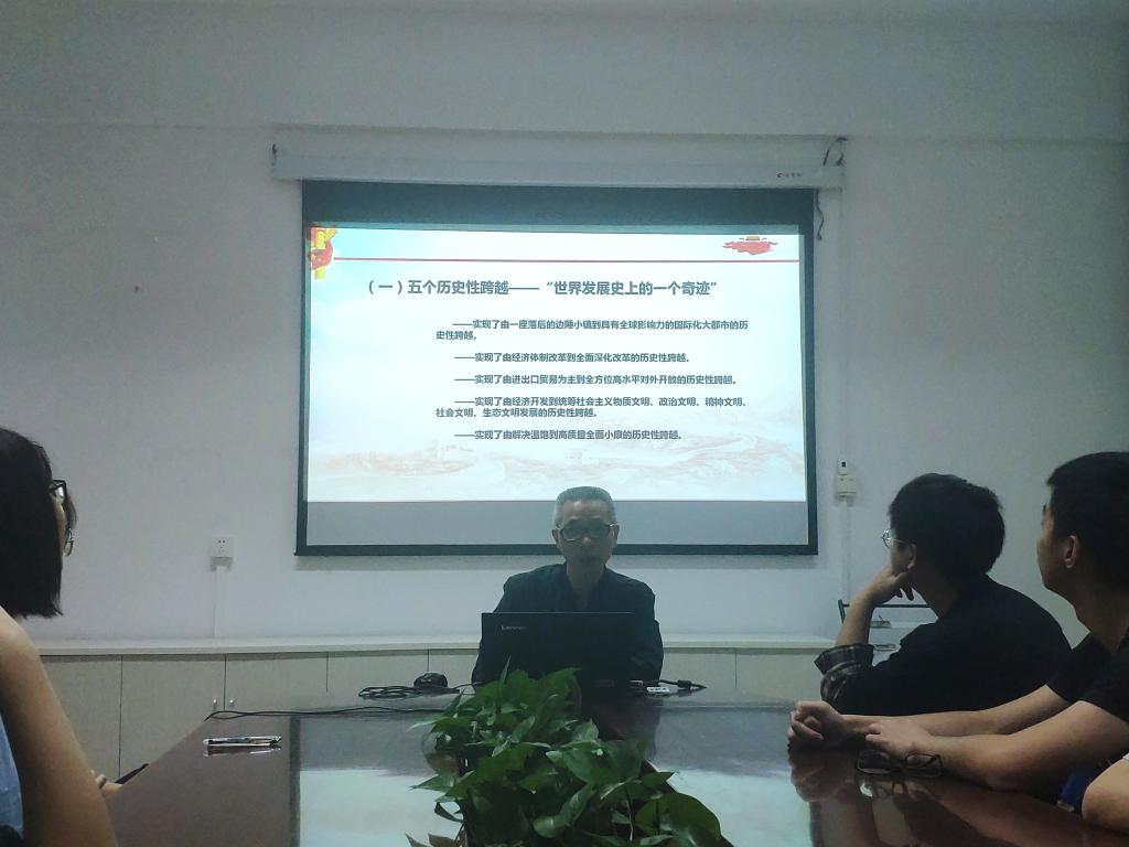同學(xué)們簽到后,由胡濟(jì)林老師進(jìn)行了《學(xué)習(xí)習(xí)近平總書記《在深圳經(jīng)濟(jì)特區(qū)建立40周年慶祝大會上的講話》的專題匯報。胡老師首先介紹了我國設(shè)立經(jīng)濟(jì)特區(qū)的過程,接著回顧了習(xí)近平總書記的三次深圳之行,最后重點解讀習(xí)近平總書記《在深圳經(jīng)濟(jì)特區(qū)建立40周年慶祝大會上的講話》,主要內(nèi)容包括習(xí)近平總書記用五個“歷史性跨越”來概括深圳奇跡,總結(jié)了經(jīng)濟(jì)特區(qū)40年改革開放、創(chuàng)新發(fā)展積累的十條寶貴經(jīng)驗,對新時代經(jīng)濟(jì)特區(qū)建設(shè)作出六方面部署等。胡老師指出,深圳是改革開放后黨和人民一手締造的嶄新城市,是中國特色社會主義在一張白紙上的精彩演繹,充分彰顯中國特色社會主義制度的優(yōu)越性,我們要認(rèn)真領(lǐng)會習(xí)近平總書記的重要講話精神,學(xué)習(xí)深圳特區(qū)“闖”的精神、“創(chuàng)”的勁頭、“干”的作風(fēng),并轉(zhuǎn)化為學(xué)習(xí)上的強(qiáng)大動力。胡老師報告結(jié)束后,同學(xué)們分享了自己的學(xué)習(xí)心得。