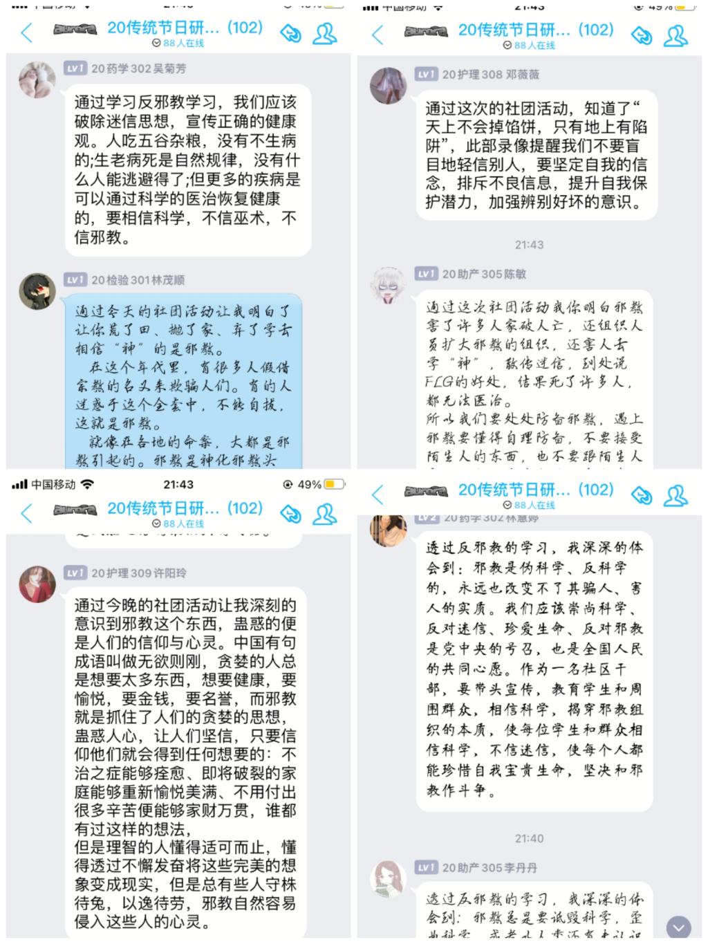 大會(huì)結(jié)束后,傳統(tǒng)節(jié)日研習(xí)社成員在線上展開(kāi)了熱烈討論,積極踴躍地發(fā)表了警示教育短片觀后感,他們表示邪教是偽科學(xué)、反科學(xué)的,應(yīng)該崇尚科學(xué)、反對(duì)迷信、反對(duì)邪教、珍愛(ài)生命,要堅(jiān)定科學(xué)信念,努力學(xué)習(xí)科學(xué)知識(shí),從科學(xué)的精神和態(tài)度把握生活,不斷提高自身識(shí)別和防范邪教的能力。