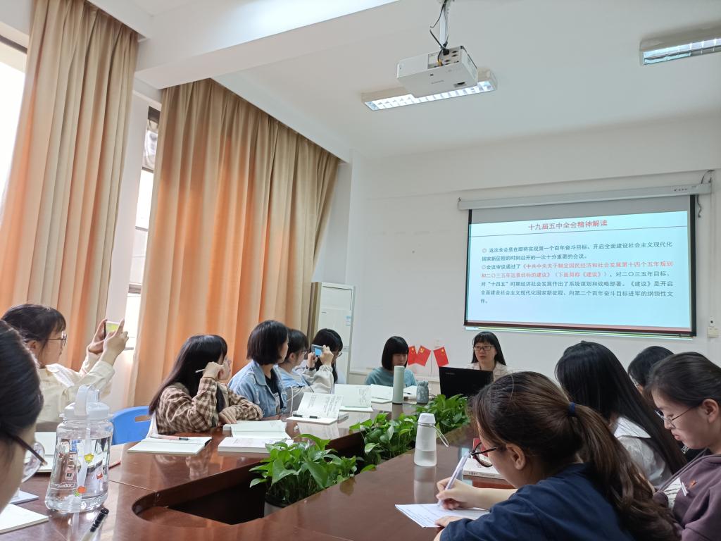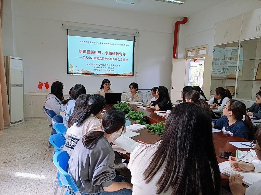 隨后進入專題學習,主題為《新征程新?lián)敚瑺幾鲇埠饲嗄辍钊雽W習貫徹黨的十九屆五中全會精神》。熊老師從五中全會的召開背景、主要成果、特點亮點、邏輯主線、主要內容和貫徹落實等6個方面為同學們深入解析全會精神和主要內容。這次全會是在我國將進入新發(fā)展階段、實現(xiàn)中華民族偉大復興正處在關鍵時期召開的一次具有全局性、歷史性意義的重要會議。 “十四五”時期是我國全面建成小康社會、實現(xiàn)第一個百年奮斗目標之后,乘勢而上開啟全面建設社會主義現(xiàn)代化國家新征程、向第二個百年奮斗目標進軍的第一個五年。站在新的歷史起點上,我們黨已經在第一個百年團結帶領人民書寫了偉大奇跡,也必將在未來團結帶領人民創(chuàng)造新的更大奇跡。