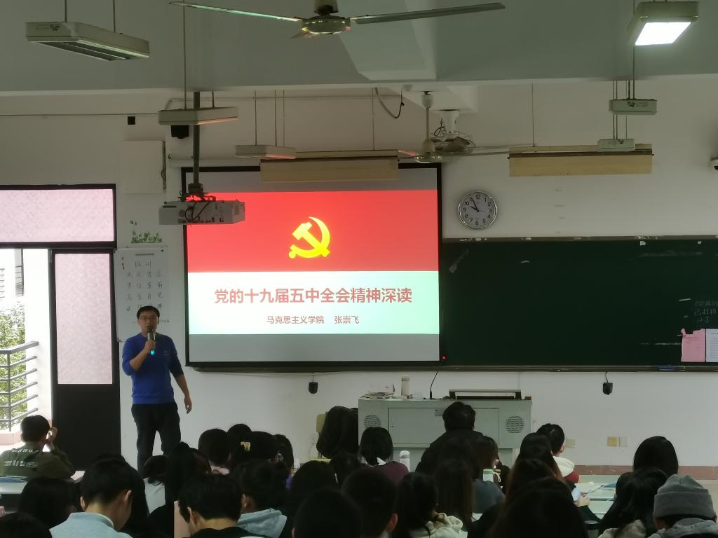 根據(jù)馬克思主義學(xué)院統(tǒng)一安排,2020年12月7日和8日,張崇飛老師分別為八一學(xué)社全體社員、20級藥學(xué)301、302和20康復(fù)301、302及20中醫(yī)康復(fù)301班學(xué)生中對黨的十九屆五中全會精神進行了深度解讀。兩場宣講會共300余名同學(xué)參加。