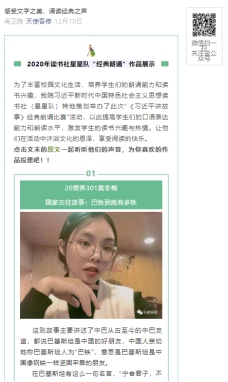 暮冬來襲,美音環(huán)繞。習(xí)近平新時(shí)代中國特色社會(huì)主義思想讀書社“星星隊(duì)”迎來了一年一度的經(jīng)典朗讀大賽。為期半個(gè)多月的活動(dòng)于12月26日在教學(xué)樓309落下帷幕。此次活動(dòng)經(jīng)過前期的策劃,全體隊(duì)員的參與,于12月10日通過易班優(yōu)課平臺(tái)和讀書社“天使吾修”微信公眾號(hào)開展了朗讀大會(huì)以及大眾投票環(huán)節(jié)。