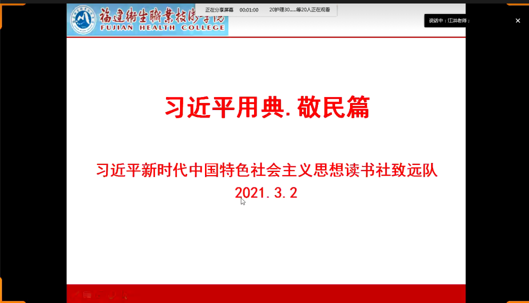 2021年3月2日,習(xí)近平新時代中國特色社會主義思想讀書社社團選修課《習(xí)近平用典》開課了,課程由社團指導(dǎo)老師江洪老師主講,因疫情原因,采取線上教學(xué),全體選課同學(xué)按時參加了課程學(xué)習(xí)。