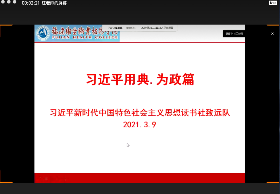 2021年3月9日,習(xí)近平新時代中國特色社會主義思想讀書社致遠(yuǎn)隊線上開展了社團(tuán)選修課《習(xí)近平用典》“為政篇”學(xué)習(xí)。本次課由社團(tuán)指導(dǎo)老師江洪老師主講,全體選課同學(xué)按時參加了學(xué)習(xí)。