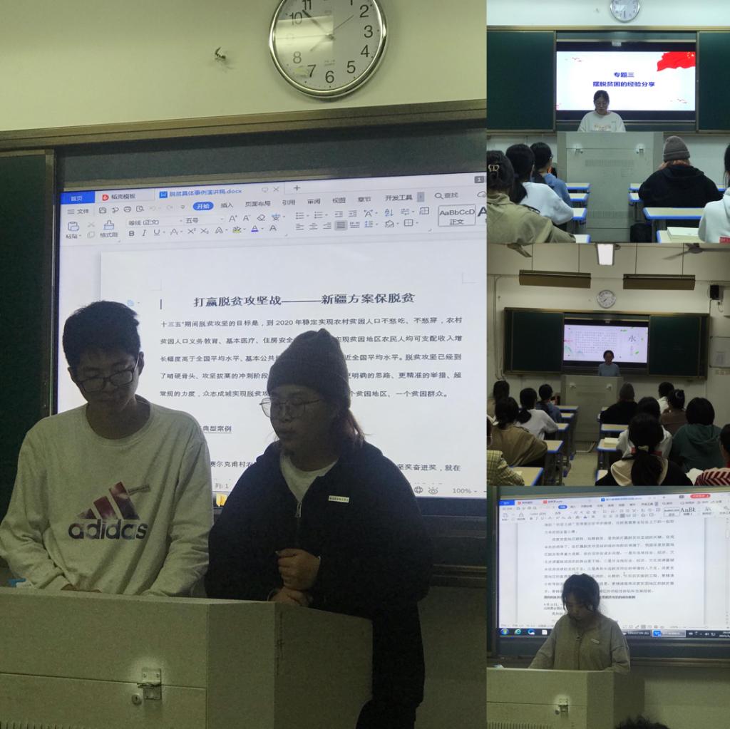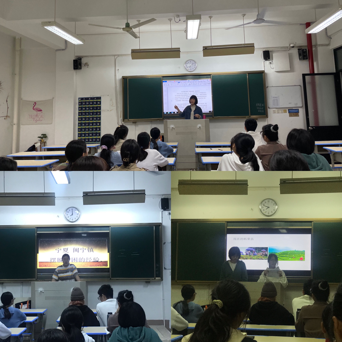 活動(dòng)之前,鄭冰老師就本次主題討論的目的和意義進(jìn)行了簡要的說明,同學(xué)們前期也進(jìn)行了積極和認(rèn)真的準(zhǔn)備,自信滿滿的站上講臺分享各自的案例。鄭林昕、江鐘靈、鄭可欣、黃靈敏、江雪兒、林彬、李順、李詩婷和李爽等同學(xué)分別就寧德、福建省永泰縣、寧夏閩寧鎮(zhèn)、福建省柘榮縣以及新疆等地區(qū)擺脫貧困的經(jīng)驗(yàn)進(jìn)行了交流和分享。