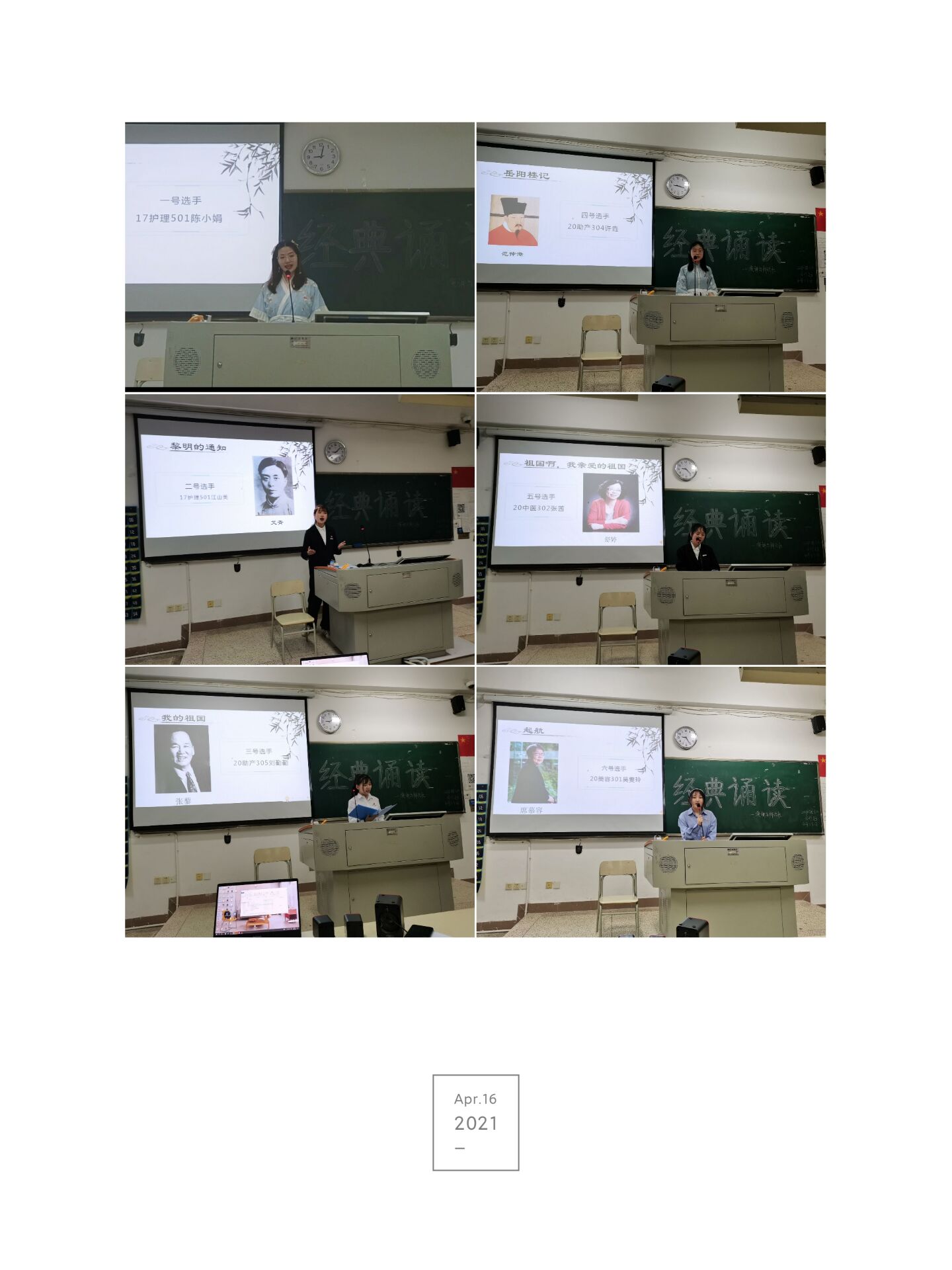 眼睛是心靈的窗戶(hù),書(shū)本是智慧的明燈。為了讓同學(xué)們從經(jīng)典詩(shī)歌中感受中華民族深厚的文化底蘊(yùn)與人文精華,同時(shí)為弘揚(yáng)中華優(yōu)秀傳統(tǒng)文化,演講與辯論社于2021年3月30日舉辦了一場(chǎng)以“誦經(jīng)典,詠文化”為主題的誦讀比賽,全院同學(xué)們積極參與,經(jīng)過(guò)嚴(yán)格的篩選,最終有15名同學(xué)進(jìn)入決賽。