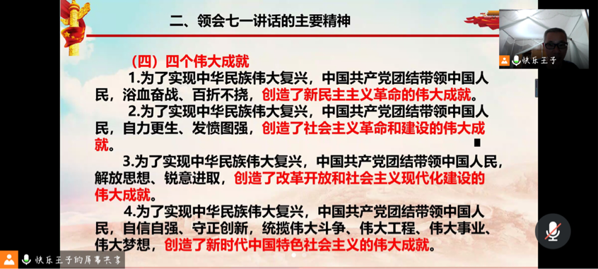 為了更好地領(lǐng)會習(xí)近平總書記在慶祝中國共產(chǎn)黨成立100周年大會上的重要講話精神,2021年9月20日晚上,習(xí)近平新時代中國特色社會主義思想讀書社宣講團(tuán)在騰訊會議開展專題學(xué)習(xí)活動,此次活動主要由胡濟(jì)林老師宣講。