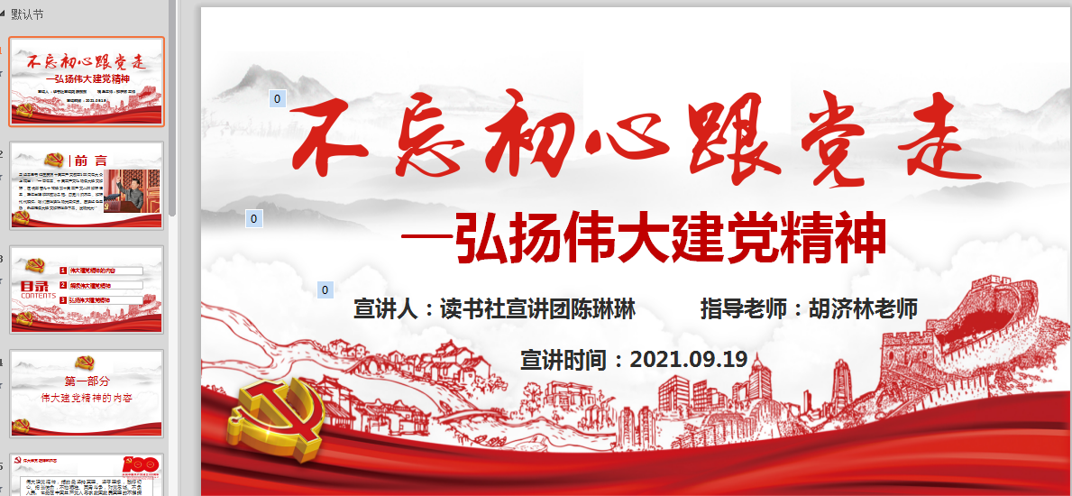 2021年9月19日下午,在胡濟(jì)林老師的指導(dǎo)下,習(xí)近平新時(shí)代中國特色社會主義思想讀書社宣講團(tuán)在線上通過騰訊會議,為20中醫(yī)養(yǎng)生保健301班、20營養(yǎng)301班開展“不忘初心 跟黨走----不忘初心 跟黨走—弘揚(yáng)偉大建黨精神”主題宣講。