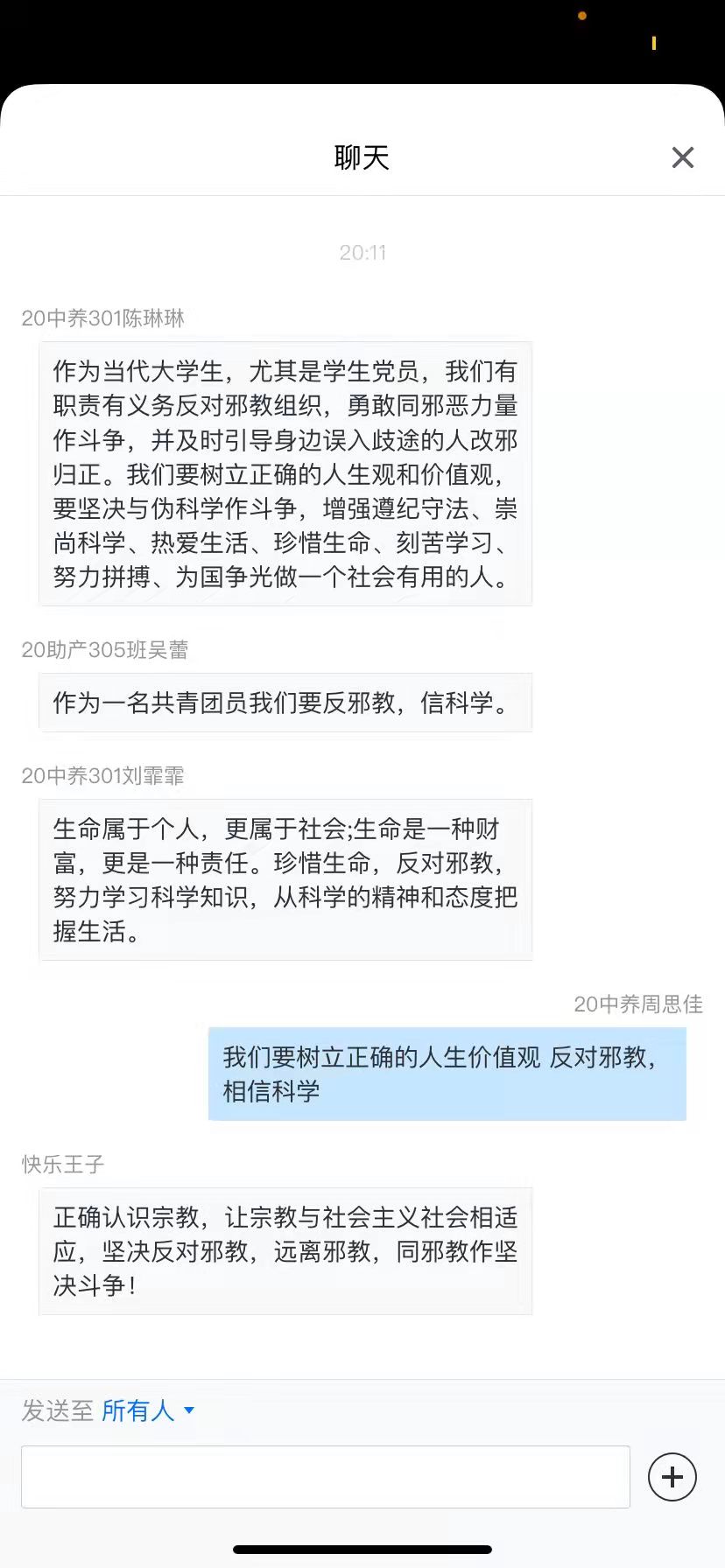 報(bào)告結(jié)束后,牛莉、謝佳毅兩位同學(xué)分別進(jìn)行“反邪教”、“如何反對邪教”的分享與交流。他們從多方面、多層次深入講述了邪教的種類、組織結(jié)構(gòu)、活動(dòng)形式等,還舉例了各種案例與面對邪教的措施,進(jìn)一步加深了同學(xué)們對邪教的認(rèn)識,讓我們受益匪淺。兩位同學(xué)制作的課件精美,內(nèi)容豐富,側(cè)重點(diǎn)不同,講解語言連貫,條理清晰,得到老師和同學(xué)的一致好評。課件展示結(jié)束后,同學(xué)們還分享了本次學(xué)習(xí)的心得體會。