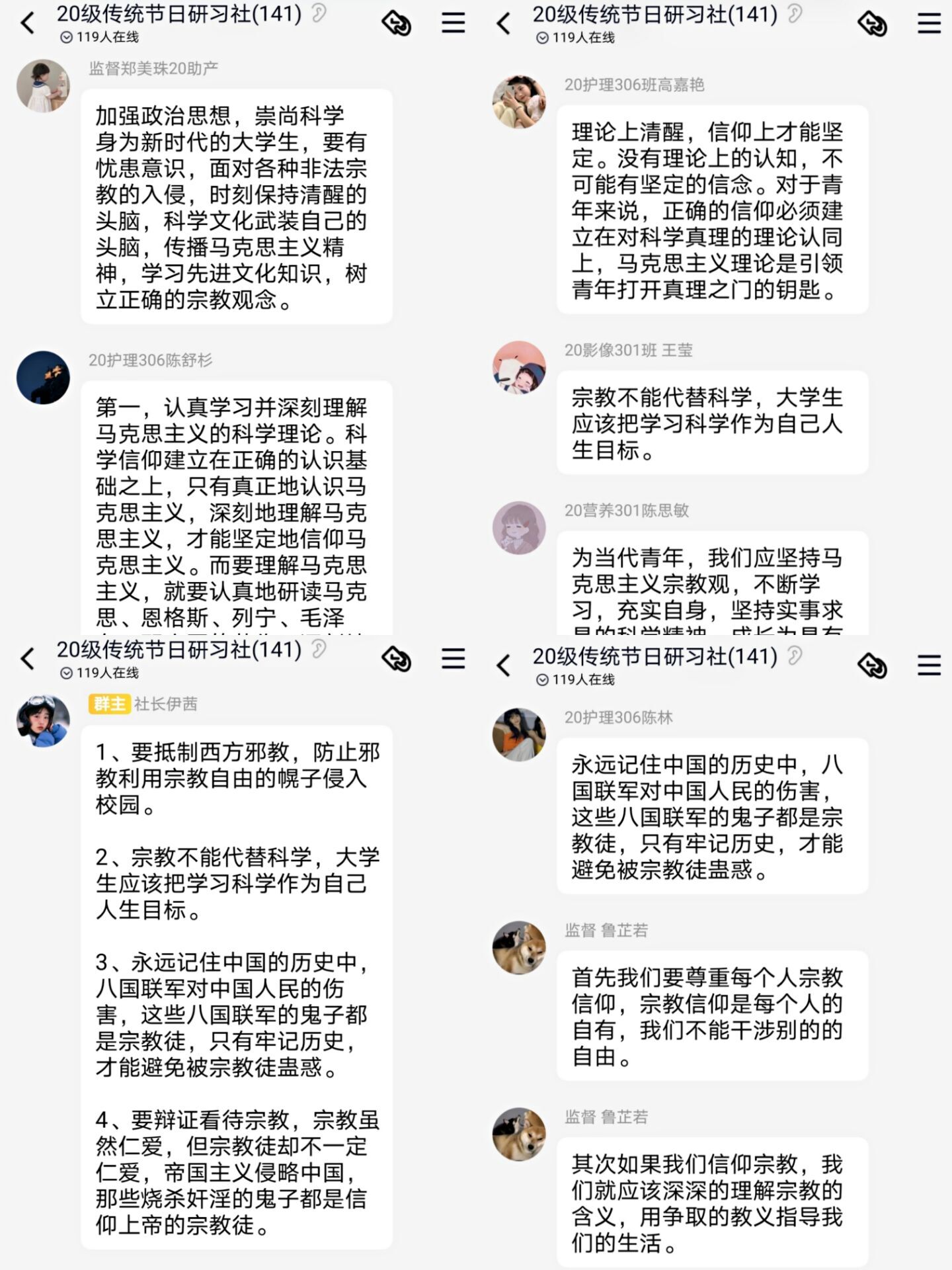 習(xí)近平總書記強(qiáng)調(diào):“要把握工作重點(diǎn),引導(dǎo)青年樹立正確的宗教觀,積極引導(dǎo)宗教與社會(huì)主義社會(huì)相適應(yīng)。無(wú)論是過(guò)去現(xiàn)在還是將來(lái),對(duì)馬克思主義的信仰,對(duì)中國(guó)特色社會(huì)主義的信念都是指引中國(guó)人民奮發(fā)向上的精神力量。青年一代有理想、有擔(dān)當(dāng),國(guó)家就有前途,民族就有希望?!鳖伇P也向社團(tuán)成員提出期許,希望同學(xué)們能努力學(xué)習(xí)科學(xué)文化知識(shí),牢固樹立馬克思主義宗教觀,樹立正確的世界觀、人生觀、價(jià)值觀。