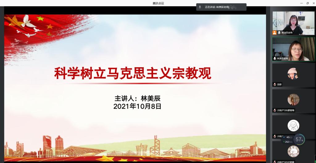 為深入學(xué)習(xí)貫徹習(xí)近平總書記關(guān)于宗教工作重要論述和重要指示批示精神,樹立馬克思主義宗教觀,培養(yǎng)青年學(xué)生正確思想道德價(jià)值觀。2021年10月8日晚,馬克思主義學(xué)院林美辰、顏冰鳳兩位老師為社團(tuán)全體成員開展了線上學(xué)習(xí)宣講。