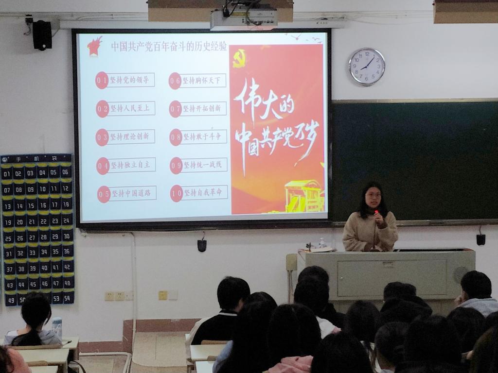 開展本次宣講的是李海丹和張玲馨小組,宣講人是李海丹,她首先給大家介紹中國(guó)共產(chǎn)黨的性質(zhì)和歷史使命,分享了黨的奮斗百年的十個(gè)歷史經(jīng)驗(yàn),并結(jié)合抗美援朝和抗擊新冠肺炎疫情,重點(diǎn)闡述堅(jiān)持人民至上、堅(jiān)持敢于斗爭(zhēng)等歷史經(jīng)驗(yàn),隨后分享了黨的奮斗百年的歷史意義,她號(hào)召同學(xué)們學(xué)好黨史,堅(jiān)持以習(xí)近平新時(shí)代中國(guó)特色社會(huì)主義思想為指導(dǎo),為實(shí)現(xiàn)中華民族偉大復(fù)興的中國(guó)夢(mèng)貢獻(xiàn)出綿薄之力。