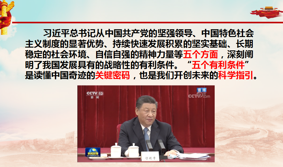 宣講伊始,胡濟(jì)林分析了“五個(gè)有利條件”相互間的關(guān)系,指出今天中國(guó)改革發(fā)展的偉大成就源于中國(guó)共產(chǎn)黨的堅(jiān)強(qiáng)領(lǐng)導(dǎo)。只有在黨的堅(jiān)強(qiáng)領(lǐng)導(dǎo)下,其他四個(gè)有利條件才能產(chǎn)生,沒(méi)有黨的堅(jiān)強(qiáng)領(lǐng)導(dǎo),就談不上其他四個(gè)有利條件。接著分別就中國(guó)共產(chǎn)黨的堅(jiān)強(qiáng)領(lǐng)導(dǎo)、中國(guó)特色社會(huì)主義制度的顯著優(yōu)勢(shì)、持續(xù)快速發(fā)展積累的堅(jiān)實(shí)基礎(chǔ)、長(zhǎng)期穩(wěn)定的社會(huì)環(huán)境、自信自強(qiáng)的精神力量等五個(gè)方面進(jìn)行詳細(xì)的解讀,講授中,胡濟(jì)林用詳實(shí)的數(shù)據(jù)和豐富的案例,引導(dǎo)同學(xué)們深刻把握我國(guó)發(fā)展的五個(gè)戰(zhàn)略性“有利條件”,勉勵(lì)大家踔厲奮發(fā)、篤行不怠,刻苦學(xué)習(xí),勇于拼搏,以優(yōu)異的成績(jī)迎接黨的二十大勝利召開(kāi)。