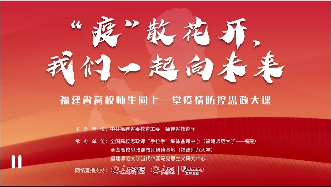 此次直播以“‘疫’散花開,我們一起向未來”為主題,邀請到了來自福建省各高校的五位教授,五位教授緊密結(jié)合高校思想政治理論課,講述我省抗疫一線的感人故事,解讀黨中央關于疫情防控的決策部署,教育引導廣大師生深刻認識中國特色社會主義制度的顯著優(yōu)勢,牢記“兩個確立”、增強“四個意識”、堅定“四個自信”、做到“兩個維護”。
