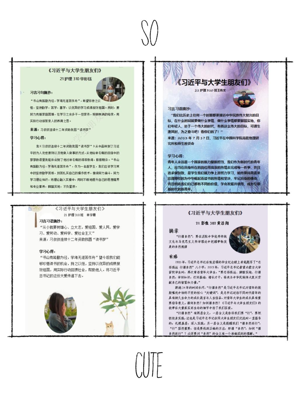 社員們從《習(xí)近平與大學(xué)生朋友們》包含的25篇采訪實(shí)錄中摘錄最喜歡的習(xí)言習(xí)語(yǔ),并進(jìn)行心得交流和作品展示。以下是部分隊(duì)員的作品展示: