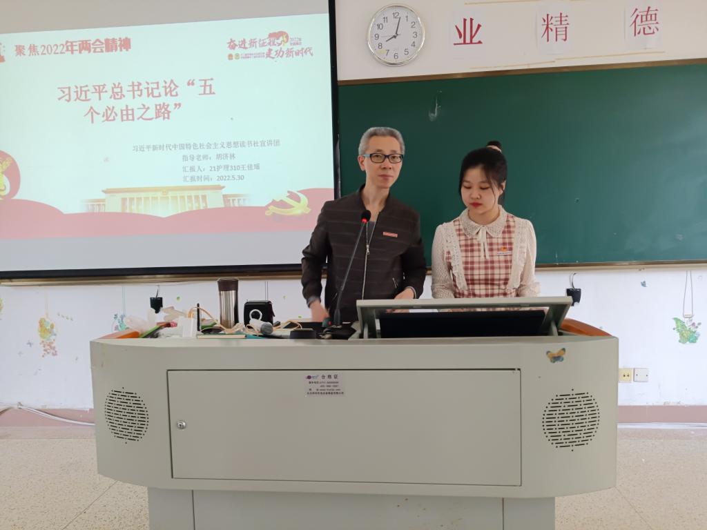 2022年3月5日,習(xí)近平總書記在參加十三屆全國人大五次會議內(nèi)蒙古代表團審議時,用“五個必由之路”深刻揭示了中國答卷背后的成功密碼。為了更好地把握兩會精神,堅定“四個自信”,習(xí)近平新時代中國特色社會主義思想讀書社宣講團在5月30日上午,在馬克思主義學(xué)院教師胡濟林的指導(dǎo)下,到教學(xué)樓109為18衛(wèi)管501、18藥經(jīng)管501、18藥學(xué)501班開展線下學(xué)習(xí)交流。通過知識講座的方式,向同學(xué)們宣傳“習(xí)近平總書記論‘五個必由之路’”相關(guān)知識,不斷提升學(xué)生們對國家發(fā)展的認(rèn)同。