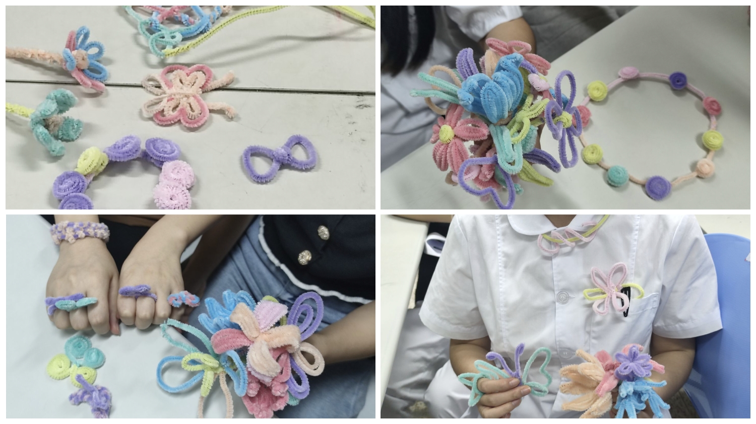 隨后同學(xué)們分組動(dòng)手制作花環(huán),不同的花環(huán)代表著同學(xué)們的美好祝愿。