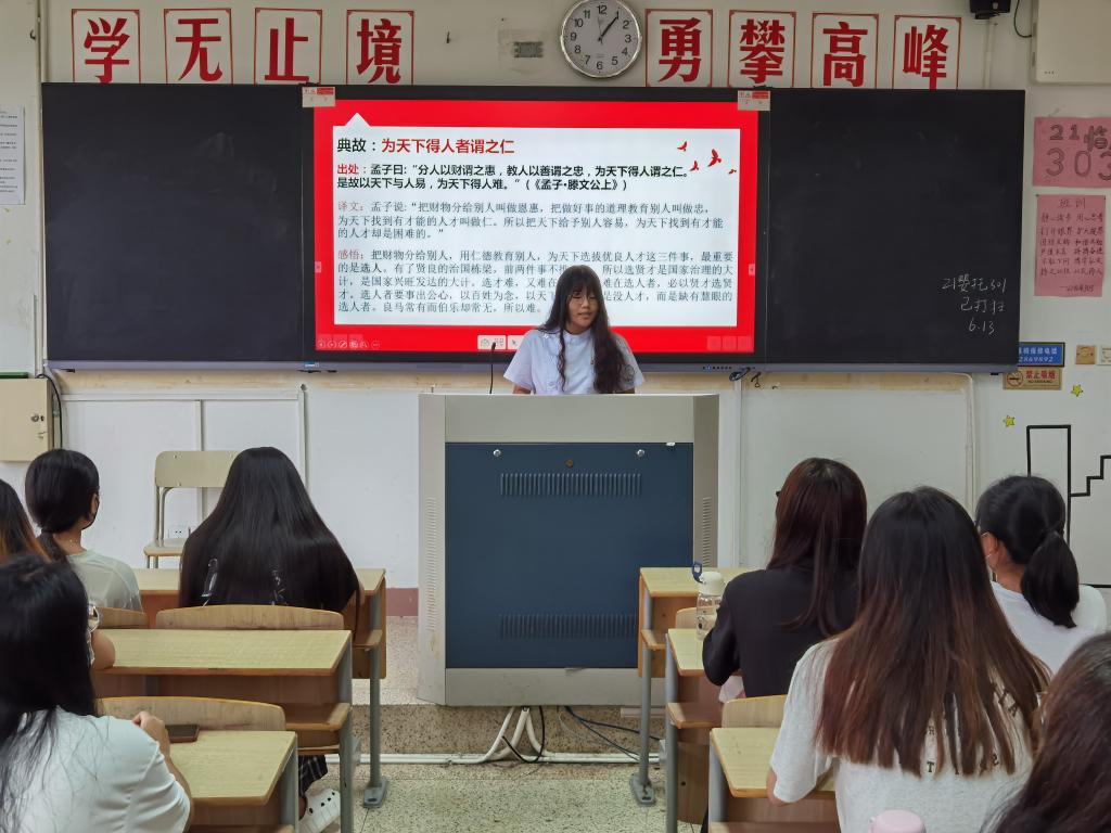 活動(dòng)伊始,由致遠(yuǎn)隊(duì)隊(duì)長(zhǎng)陳曉萍同學(xué)為我們講解習(xí)近平總書(shū)記近日發(fā)表的重要文章《堅(jiān)定不移走中國(guó)人權(quán)發(fā)展道路,更好推動(dòng)我國(guó)人權(quán)事業(yè)發(fā)展》中所引用的典故,包括“古之為政,愛(ài)人為大”“為天下得人者謂之仁”“天生萬(wàn)物,唯人為貴”“濟(jì)大事者,必以人為本”“治天下者,以人為本”等經(jīng)典,深入闡述了中國(guó)傳統(tǒng)文化以民為本的重要精神和中國(guó)共產(chǎn)黨始終堅(jiān)持以人為本、全心全意為人民服務(wù)的寶貴品格。