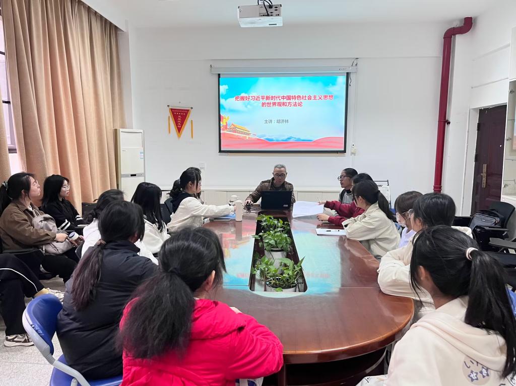 會(huì)議伊始,胡濟(jì)林副教授進(jìn)行“把握好習(xí)近平新時(shí)代中國特色社會(huì)主義思想的世界觀和方法論”專題報(bào)告,他帶領(lǐng)同學(xué)們學(xué)習(xí)了黨的二十大報(bào)告“繼續(xù)推進(jìn)實(shí)踐基礎(chǔ)上的理論創(chuàng)新,強(qiáng)調(diào)要把握好新時(shí)代中國特色社會(huì)主義思想的世界觀和方法論,堅(jiān)持好、運(yùn)用好貫穿其中的立場觀點(diǎn)方法”的重要論斷。接著,他從“必須堅(jiān)持人民至上”、“必須堅(jiān)持自信自立”、“必須堅(jiān)持守正創(chuàng)新”、“必須堅(jiān)持問題導(dǎo)向”、“必須堅(jiān)持系統(tǒng)觀念”、“必須堅(jiān)持胸懷天下”等六個(gè)方面重點(diǎn)闡釋習(xí)近平新時(shí)代中國特色社會(huì)主義思想的世界觀和方法論。