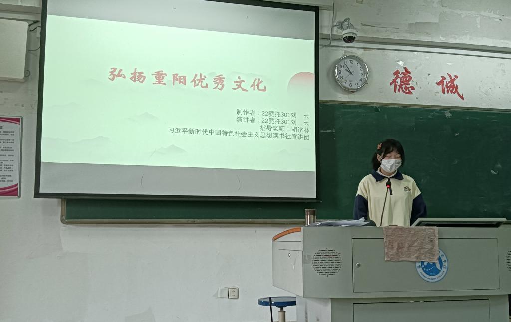 本次宣講人是22嬰托301的劉云,宣講的主題是弘揚(yáng)重陽優(yōu)秀文化。劉云首先以小視頻的形式向大家展示了重陽節(jié)的由來,其次介紹了重陽節(jié)的不同名稱和重陽節(jié)的習(xí)俗。讓同學(xué)們深度了解重陽節(jié)是我國的傳統(tǒng)節(jié)日,已列入首批國家級非物質(zhì)文化遺產(chǎn)名錄,每年農(nóng)歷九月初九為老年節(jié),她以重陽節(jié)要關(guān)心老人,弘揚(yáng)中國孝道為結(jié)尾結(jié)束本次宣講。