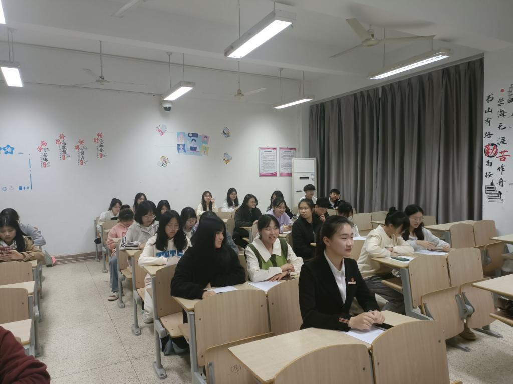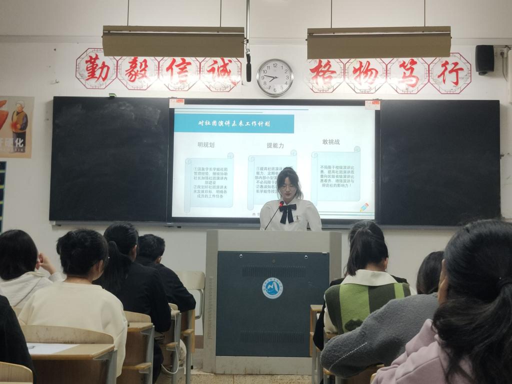 一間小小的教室里,演講與辯論社全體成員齊聚一堂。在指導(dǎo)老師來朋珍、徐舒寧,前任社長、干事的推薦和同學(xué)們的自薦下,此次大會共有11位同學(xué)參加競選。在社員們的掌聲中,干事候選人依次上臺發(fā)言講話,大家熱情洋溢地介紹著自己,暢想著社團的未來,共繪社團的美好未來藍(lán)圖。