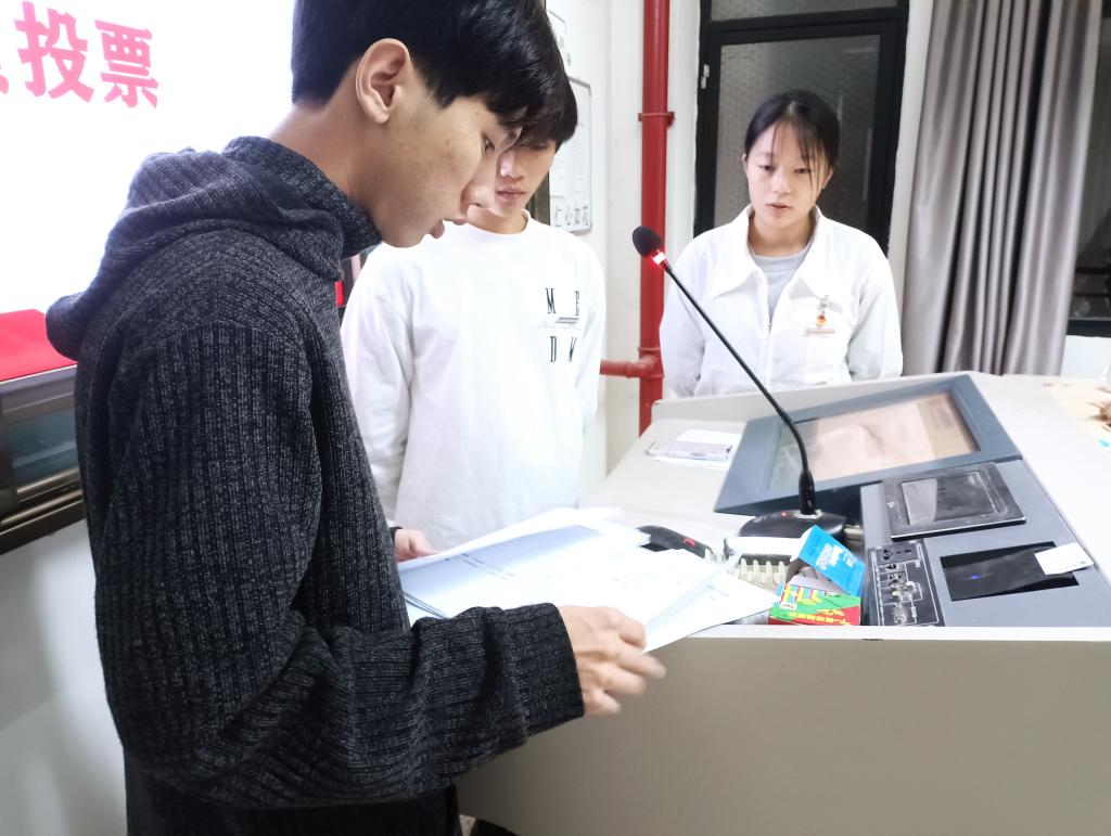 大會第三項議程:功能型團(tuán)支部委員會選舉。劉羽珊宣讀選票填寫規(guī)則及其注意事項,監(jiān)票人發(fā)放選票。各位團(tuán)員填寫選票后由檢票員收集,收集完畢由監(jiān)票人和選舉工作人員驗票,由記票人員記票。